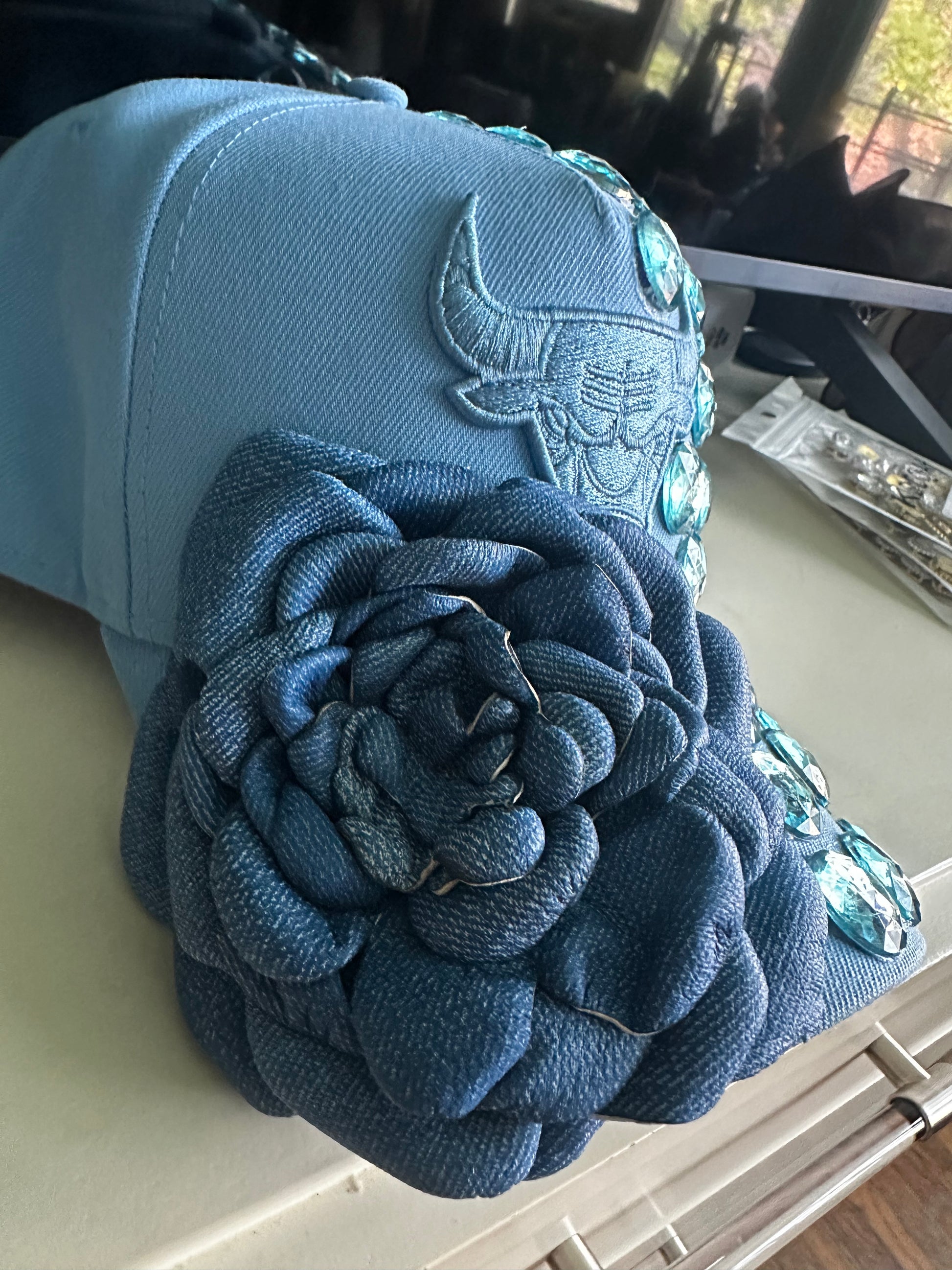 This blue Bulls hat is covered on one side with blue gemstones and adorned with a blue leather rose that looks just like denim. Style this with a crazy denim fit! It’s giving all the blues in the best way possible. Each order is custom made. Allow up to 7-14 days for completion and shipment.