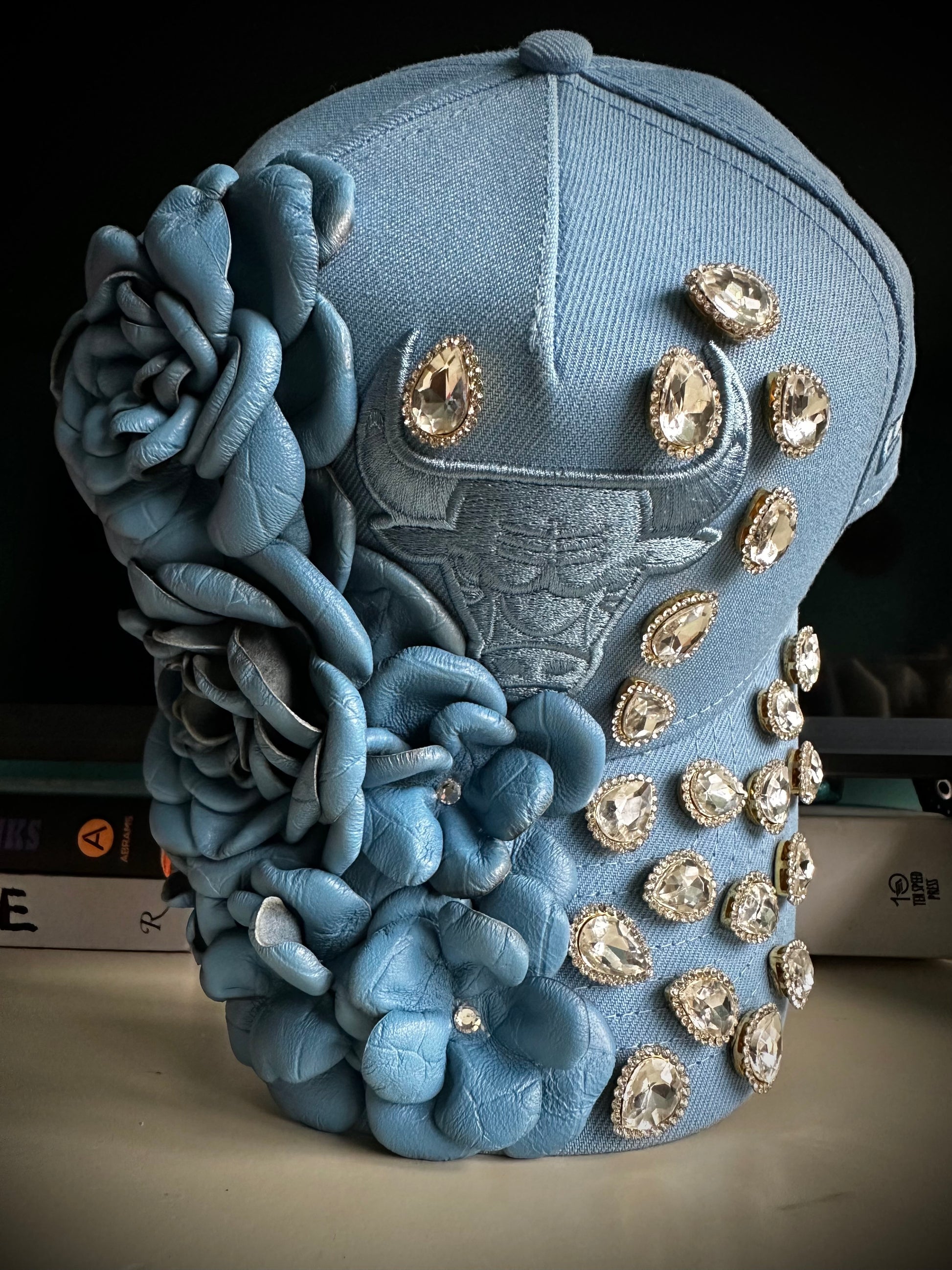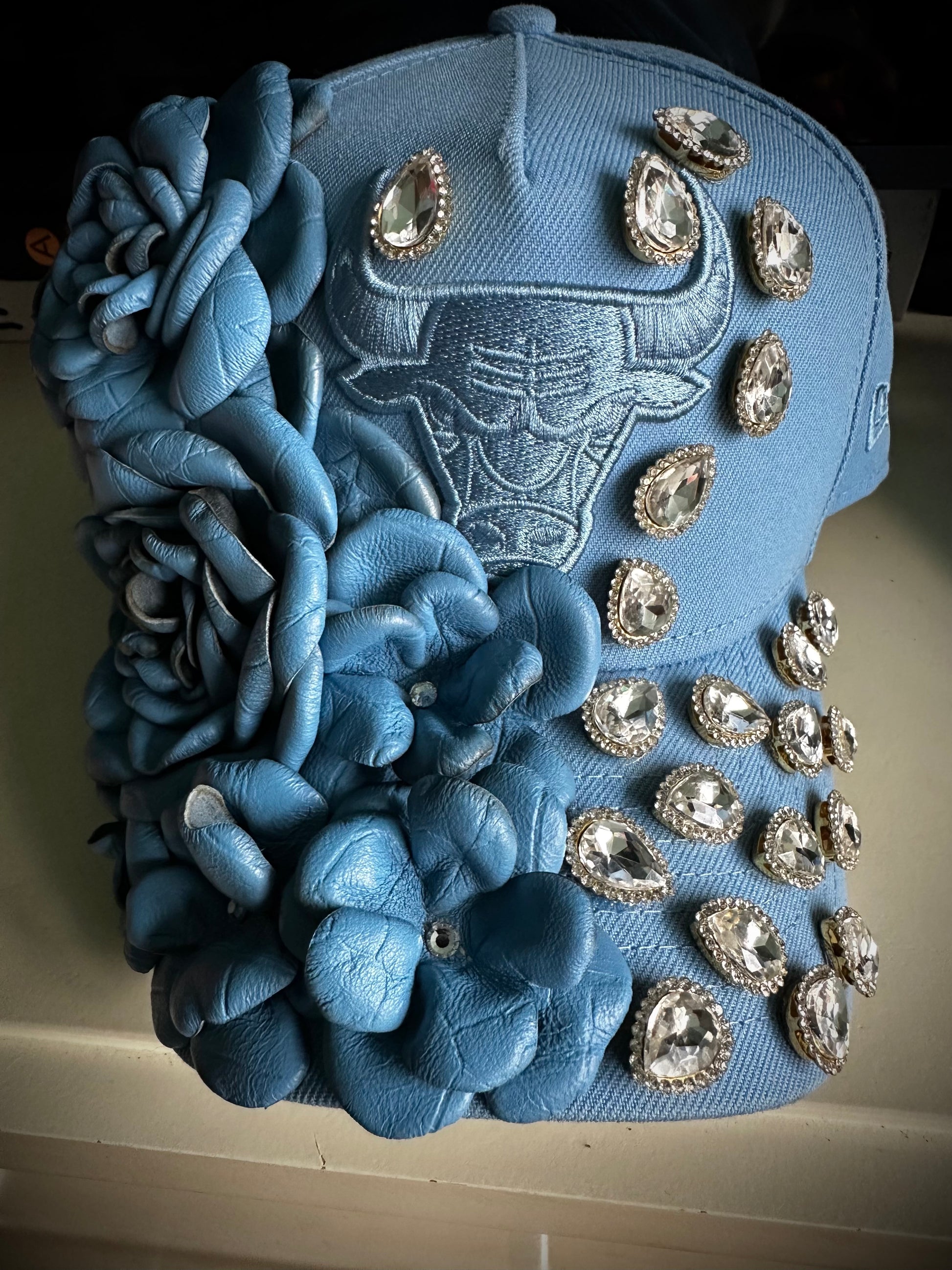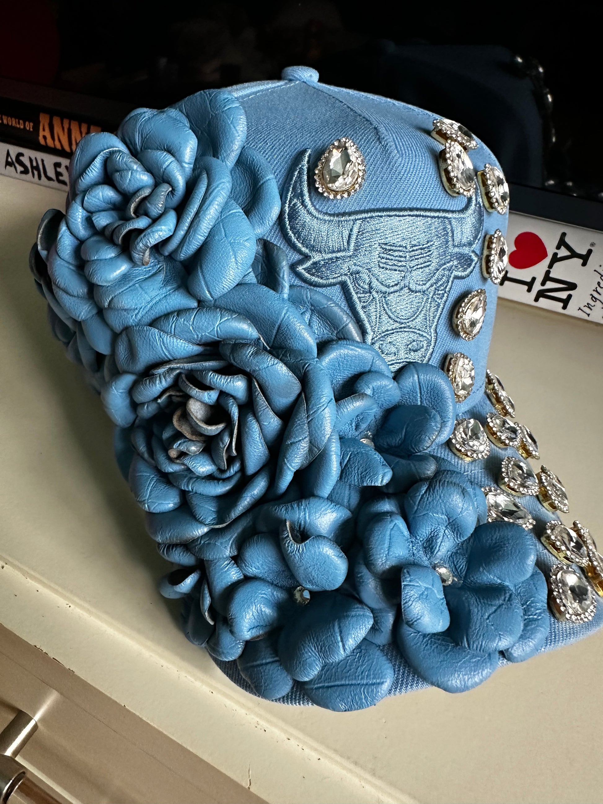 This beautiful Chicago Bulls blue SnapBack with blue leather textured roses and large rhinestone crystals represent the CHI Town vibe!
