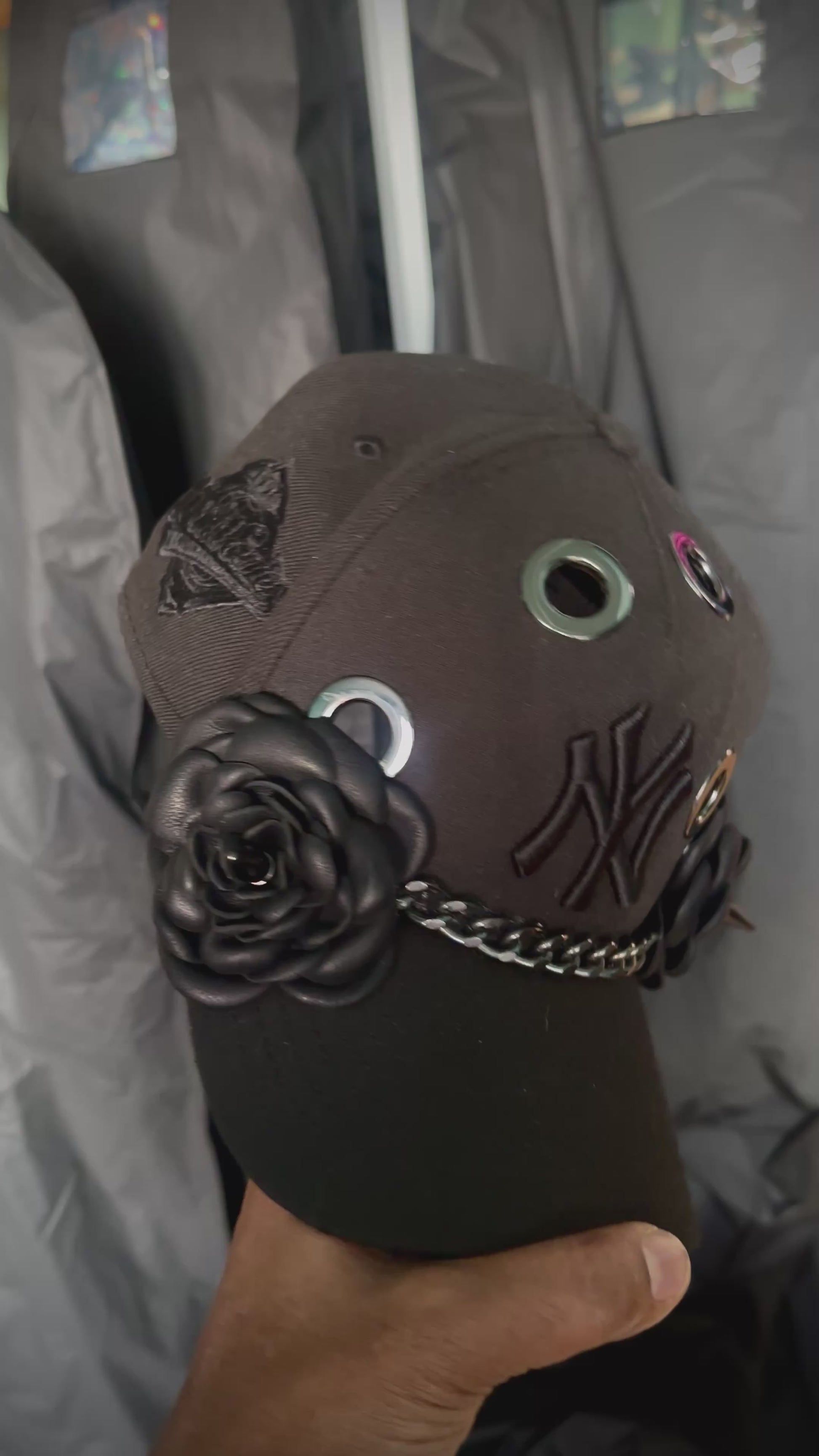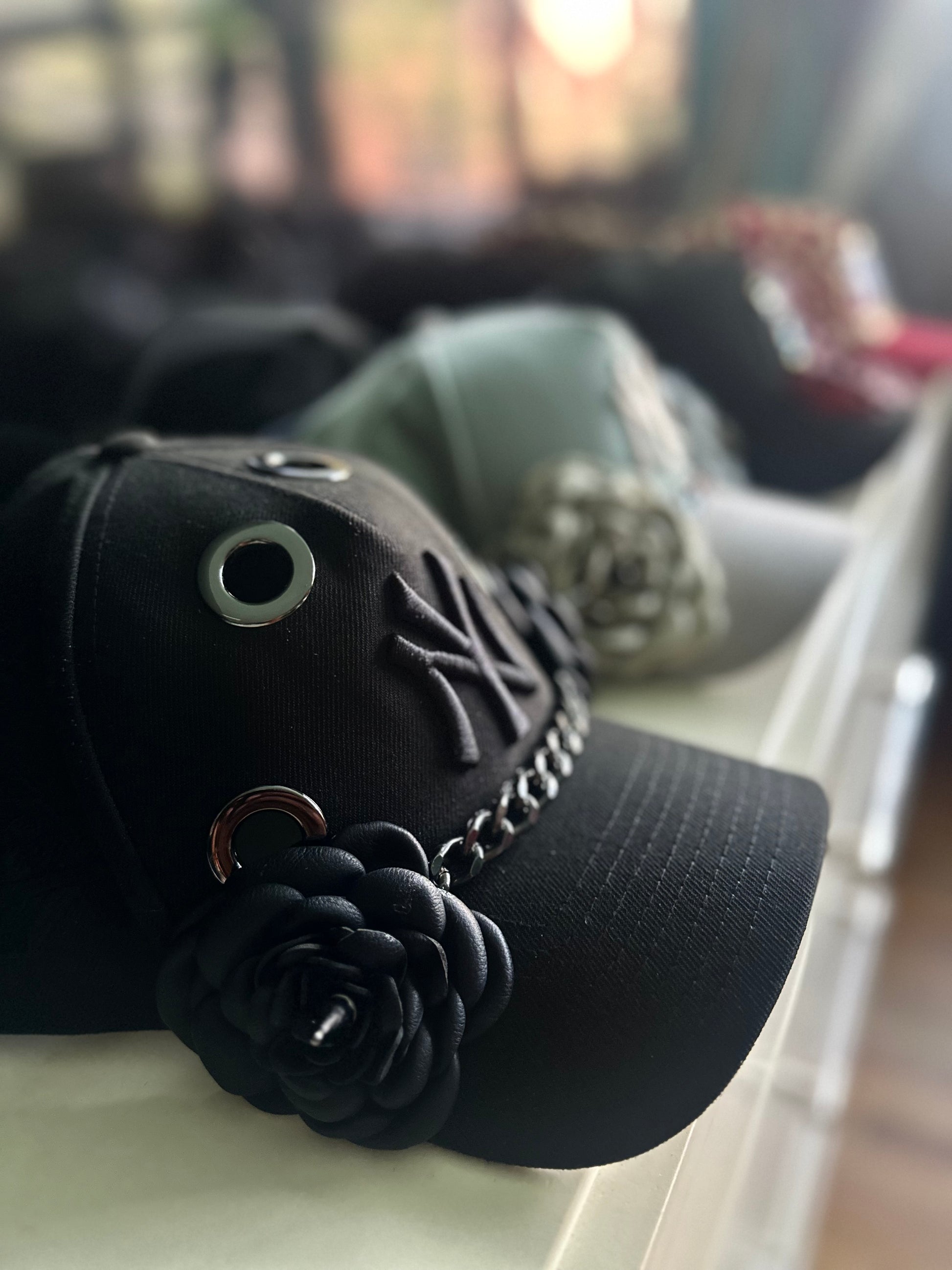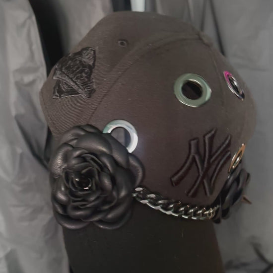 This is the SMOKE you want. Straight off the runway, this sleek, chic black on black NY SnapBack with gun metal hardware goes crazy quietly. Laced with two black leather roses, spikes as the center piece, grommets and a Cuban link…… it’s giving concrete jungle!