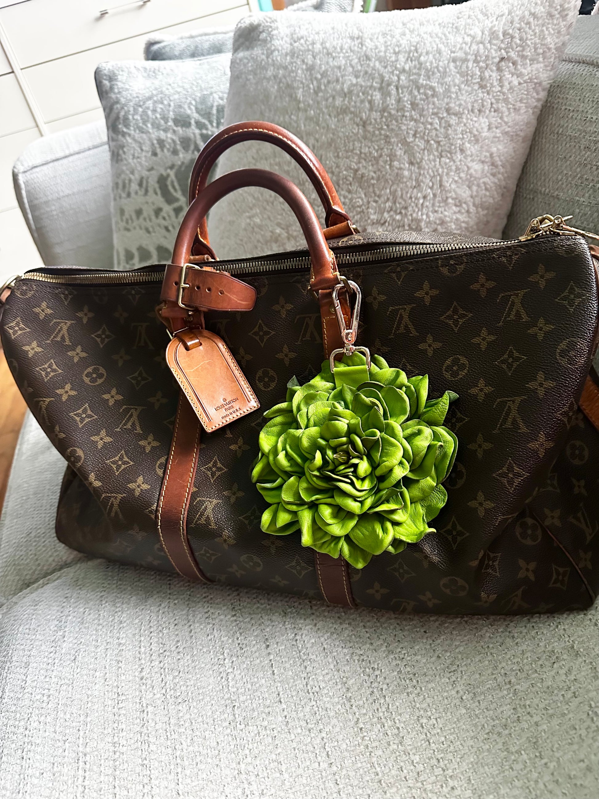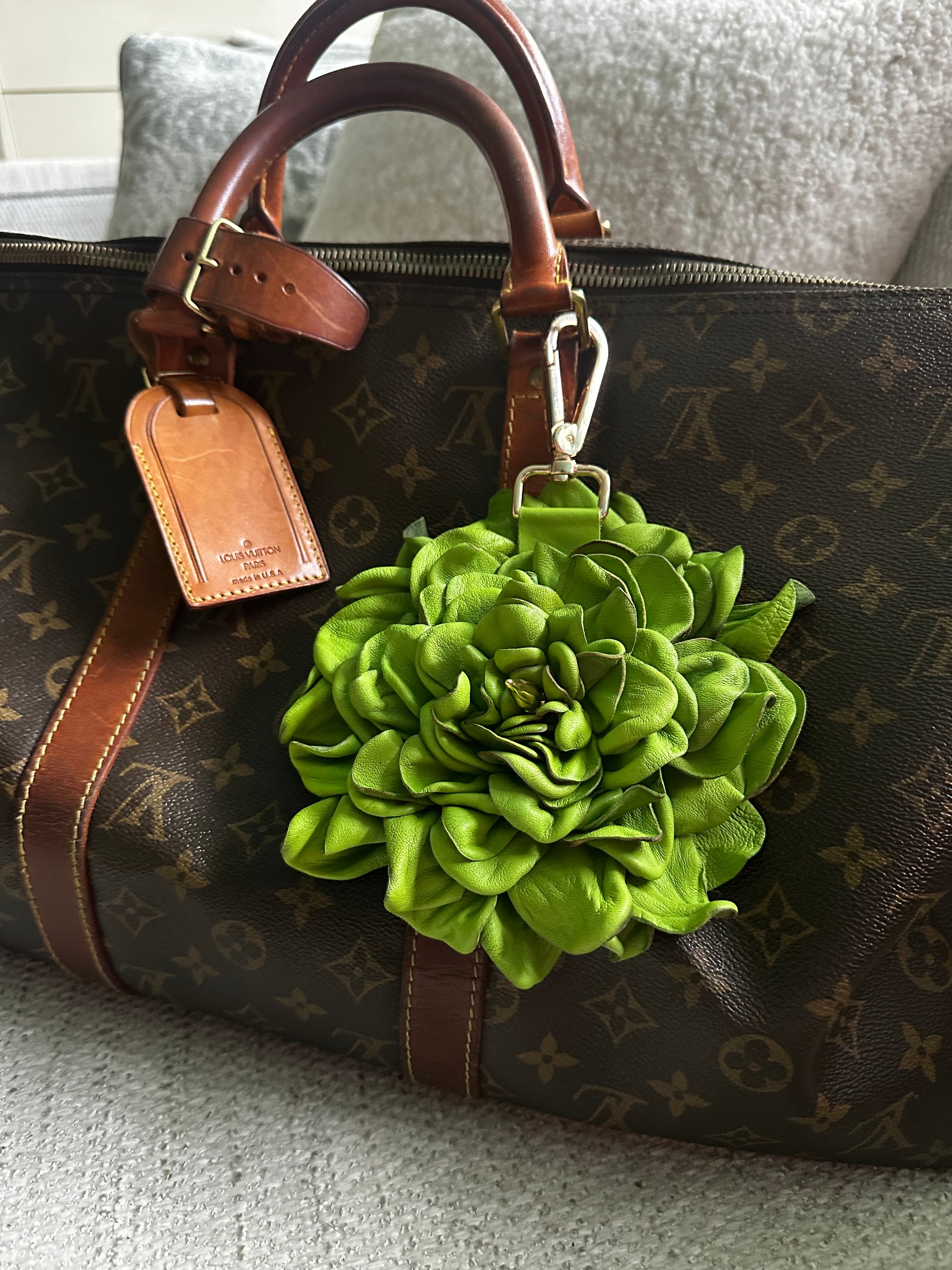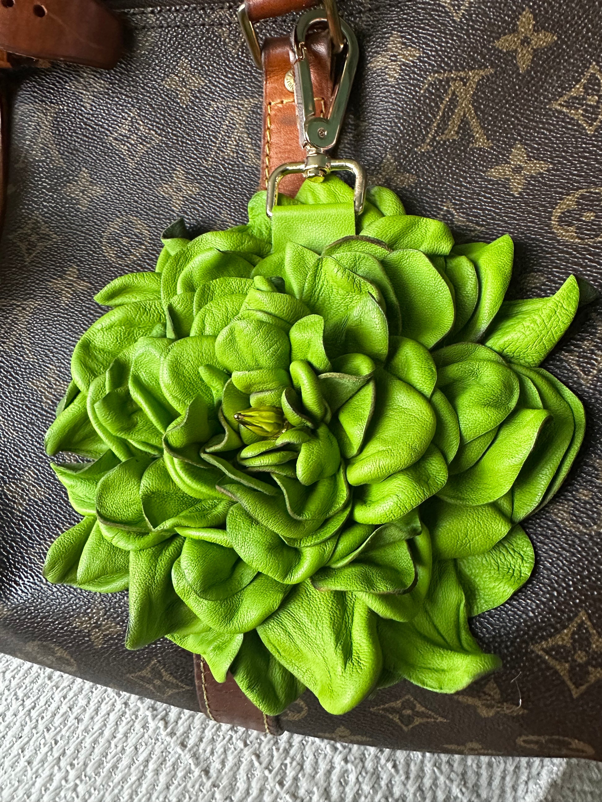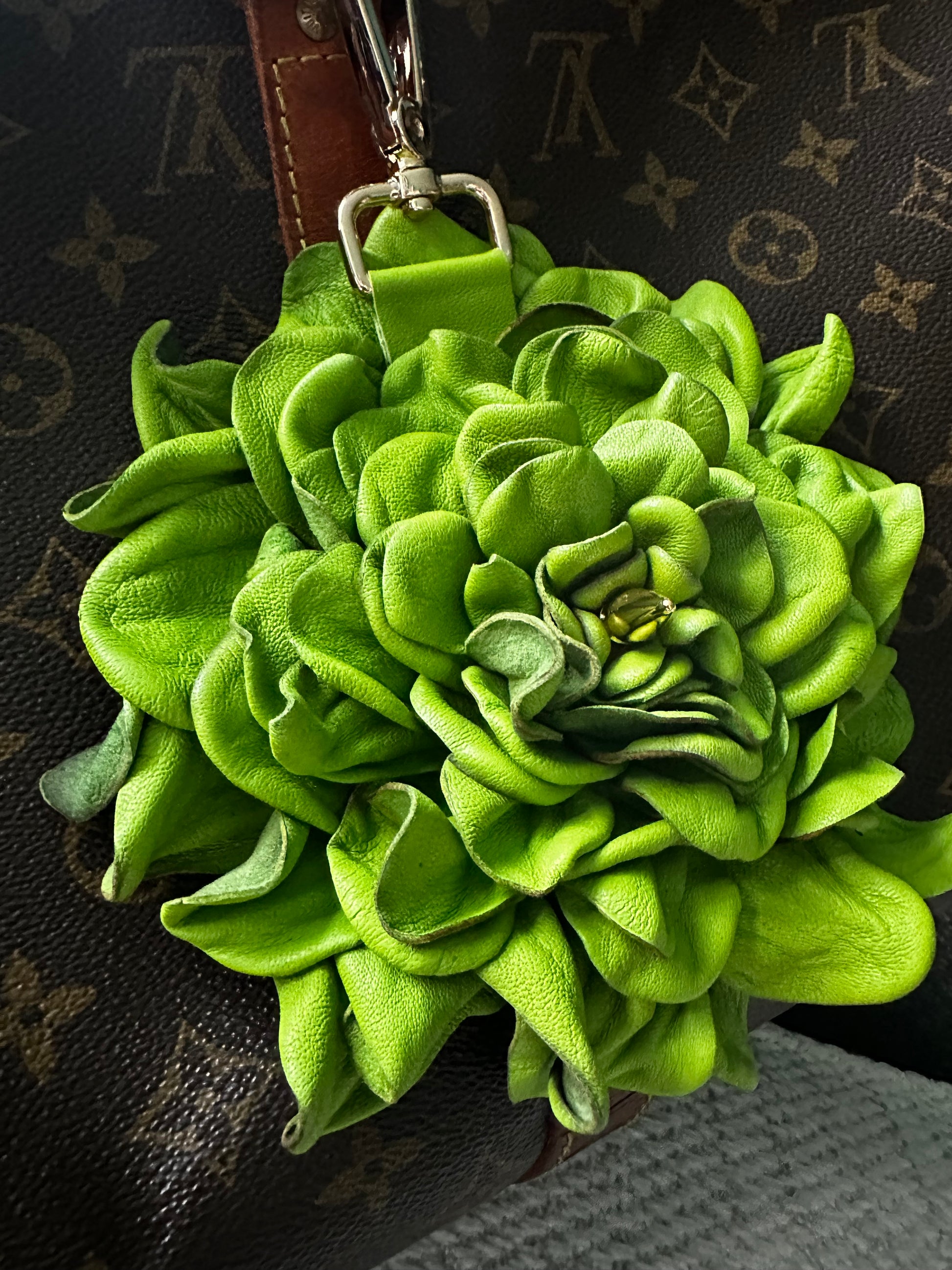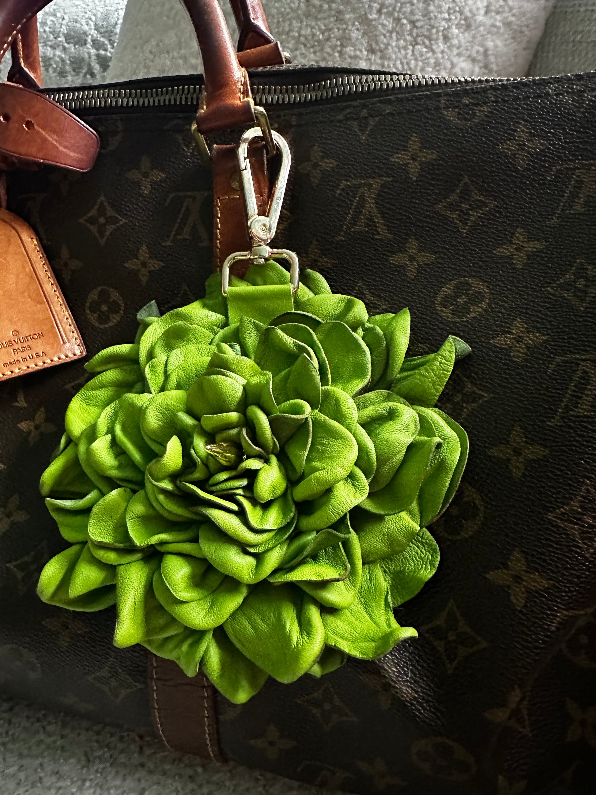 This stunning XL Green Leather floral bag charm is the ultimate accessory and conversation starter for any bag! Beautifully handcrafted and simply eye catching, this flower is one of a kind! The center is adorned with a gold spike as well as an XL gold clasp.